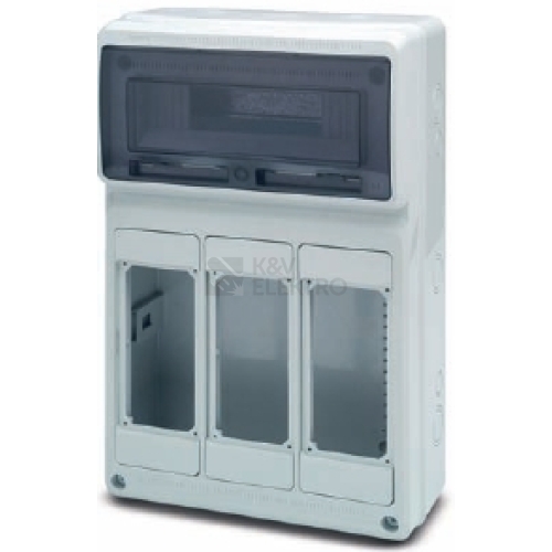 Plastová skříň AcquaCOMBI 3968 s 3 otvory pro umístění zásuvek, ve vyšším krytí IP65, 16mod., rozměry: 500x330x155mm, montáž na omítku, průhledná dvířka, barva: světle šedá.Plastová skříň AcquaCOMBI 3968 s otvorem pro umístění blokovaných zásuvek, ve vyšším krytí IP65, rozměry: 500x330x155mm, (výška x šířka x hloubka), 16mod., IK08, plastová, materiál ABS, zkouška žhavou smyčkou 650°C, bezhalogenová a UV odolná, montáž na povrch, barva: světle šedá, rozsah teplot -25°C +85°C, aplikované normy: EN 62208, balení: 1ks (fólie), polykarbonátová průhledná dvířka, hladké boky (stěny) - pro vyvrtání otvoru a osazení vývodkou (vrchní a spodní strana má stěny s předlisovanými vstupy pro vyvrtání vstupního otvoru a následného osazení příslušnou vývodkou).