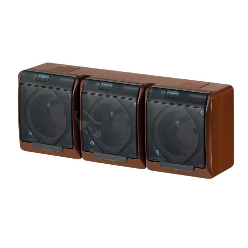 GALATEA 5323-05 IP44 Zásuvka 3x 2P+PE, 3-násobná vodorovná (hnědá / průhledné víčko)Spínače a zásuvky ve vyšším krytí GALATEA IP44 s gumovou průchodkou (pro kabely do průměru 13,5 mm a trubky do 16 mm) jsou speciálně navrženy do prostředí se zvýšeným výskytem vlhkosti a prachu. Výběr je ze tří barevných variant - bílá, bílá a černý ovládací prvek, hnědá. Odolnost proti mechanickým nárazům IK07 předurčuje k venkovnímu použití, v domácnostech, sportovištích, montážních halách, garážích, dílnách apod. Kompaktní pouzdro z odolného plastu zaručuje dlouhou životnost přístrojů. Určeno pro nástěnnou montáž (na omítku/ na povrch), UV odolný materiál. Splňuje požadavky norem ČSN EN 60669-1 (spínače) a IEC 60884-1 (zásuvky), pro montáž na hořlavé podklady doporučujeme použití nehořlavé podložky, pro rozsah teplot od -25°C do +70°C.