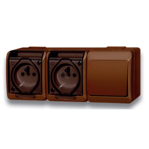 GALATEA 5327-25 IP44 Přepínač střídavý č.6 + zásuvka 2x 2P+PE (hnědá / průhledné víčko)Spínače a zásuvky ve vyšším krytí GALATEA IP44 s gumovou průchodkou (pro kabely do průměru 13,5 mm a trubky do 16 mm) jsou speciálně navrženy do prostředí se zvýšeným výskytem vlhkosti a prachu. Výběr je ze tří barevných variant - bílá, bílá a černý ovládací prvek, hnědá. Odolnost proti mechanickým nárazům IK07 předurčuje k venkovnímu použití, v domácnostech, sportovištích, montážních halách, garážích, dílnách apod. Kompaktní pouzdro z odolného plastu zaručuje dlouhou životnost přístrojů. Určeno pro nástěnnou montáž (na omítku/ na povrch), UV odolný materiál. Splňuje požadavky norem ČSN EN 60669-1 (spínače) a IEC 60884-1 (zásuvky), pro montáž na hořlavé podklady doporučujeme použití nehořlavé podložky, pro rozsah teplot od -25°C do +70°C.