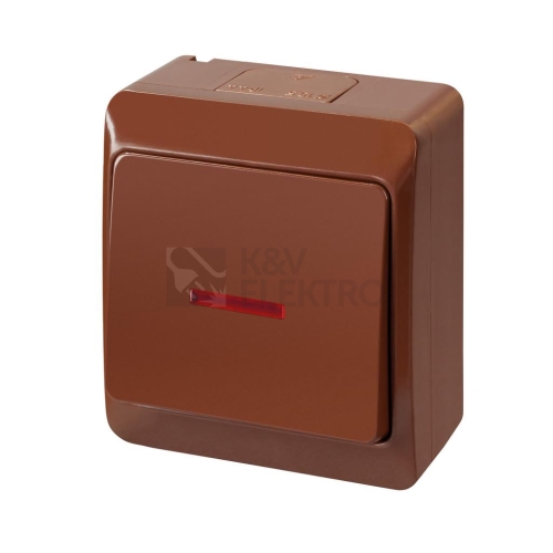 GALATEA 5341-06 IP44 Přepínač střídavý podsvětlený č.6So (hnědá)Spínače a zásuvky ve vyšším krytí GALATEA IP44 s gumovou průchodkou (pro kabely do průměru 13,5 mm a trubky do 16 mm) jsou speciálně navrženy do prostředí se zvýšeným výskytem vlhkosti a prachu. Výběr je ze tří barevných variant - bílá, bílá a černý ovládací prvek, hnědá. Odolnost proti mechanickým nárazům IK07 předurčuje k venkovnímu použití, v domácnostech, sportovištích, montážních halách, garážích, dílnách apod. Kompaktní pouzdro z odolného plastu zaručuje dlouhou životnost přístrojů. Určeno pro nástěnnou montáž (na omítku/ na povrch), UV odolný materiál. Splňuje požadavky norem ČSN EN 60669-1 (spínače) a IEC 60884-1 (zásuvky), pro montáž na hořlavé podklady doporučujeme použití nehořlavé podložky, pro rozsah teplot od -25°C do +70°C.