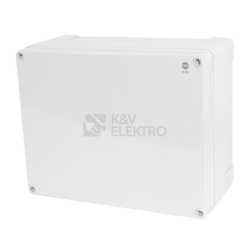 Krabice 68260 IP65 340x270x165mm, montáž na povrch, plné víko, hladké boky, plastové šrouby.Plastová krabice SolidBOX s hladkými boky v krytí IP65 a zesílenou konstrukcí, rychlá a jednoduchá montáž - plné šedé víko na šrouby, odolnost proti mechanickým nárazům IK07, pro nástěnnou montáž (na omítku), barva šedá (RAL 7035), samozhášivý, bezhalogenní UV odolný materiál, otvory do krabice se provádějí vyvrtáním otvoru a následně se osadí vývodka. Splňuje požadavky norem ČSN EN 60670-1, zkouška žhavou smyčkou 650°C (pro montáž na hořlavé podklady doporučujeme použití nehořlavé podložky), pro rozsah teplot od -40°C do +80°C.