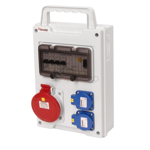 Přenosná zásuvková skříň FAMATEL eb190-6kA-EB200010.1 /8M IP44 jištěná s chráničem 40/4/003, zásuvky 2x230V, 1x32/5, přístroje EATON 6kA: 1xPL6-B16/1, 1xPL6-B32/3, PF6-40/4/003 na vstupu, použité pouzdro: 6201-20 (8mod.) - 355x215x85mm, barva: světle šedá.Přenosná zásuvková skříň (rozváděč nízkého napětí) FAMATEL eb190-6kA-EB200010.1 /8M IP44 jištěná s chráničem 40/4/003, zásuvky 2x230V/16A (s ochranným kolíkem dle ČSN), 1x400V/32A/5pól, jistící přístroje EATON 6kA: 1xPL6-B16/1, 1xPL6-B32/3, PF6-40/4/003 na vstupu (citlivost na reziduální proud 30mA), použité pouzdro: 6201-20 - celkem k dispozici 8mod. míst, rozměry: 355x215x85mm, plastová, materiál ABS, IK08, zkouška žhavou smyčkou 650°C, bezhalogenová a UV odolná, montáž na povrch, barva: světle šedá, rozsah teplot -25°C +85°C, aplikované normy: IEC 61439-3 (Rozváděče nízkého napětí - Část 3: Rozvodnice určené k provozování laiky (DBO), balení: 1ks (fólie), zásuvky na 230V/16A s ochranným kolíkem dle ČSN, polykarbonátové okénko, jistící prvky EATON, PE svorkovice součástí (6x16mm2), N svorkovice součástí (6x16mm2), hladké stěny (bez prolisů) pro vyvrtání vstupního otvoru a následné osazení příslušnou vývodkou, max. připojitelný vstupní kabel = 5x16 (Cu), dodáno s průvodní dokumentací: štítkem rozváděče, návodem pro obsluhu a montáž, krycím listem (charakteristiky rozhraní), protokolem o kusové zkoušce, ES prohlášením o shodě, schématem zapojení a zkouškou oteplení pro rozváděče nízkého napětí.