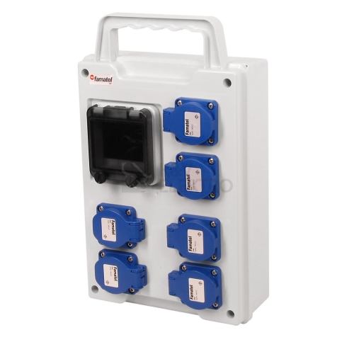 Přenosná zásuvková skříň FAMATEL eb370-EB 600000.V /4M IP44 pouze vydrátovaná, zásuvky 6x230V, použité pouzdro: 6201-10 (4mod.) - 355x215x85mm, barva: světle šedá.Přenosná zásuvková skříň (rozváděč nízkého napětí) FAMATEL eb370-EB 600000.V /4M IP44, zásuvky 6x230V/16A (s ochranným kolíkem dle ČSN), použité pouzdro: 6201-10 - celkem k dispozici 4mod. místa, rozměry: 355x215x85mm, plastová, materiál ABS, IK08, zkouška žhavou smyčkou 650°C, bezhalogenová a UV odolná, montáž na povrch, barva: světle šedá, rozsah teplot -25°C +85°C, aplikované normy: IEC 61439-3 (Rozváděče nízkého napětí - Část 3: Rozvodnice určené k provozování laiky (DBO), balení: 1ks (fólie), zásuvky na 230V/16A s ochranným kolíkem dle ČSN, polykarbonátové okénko, PE svorkovice součástí (6x16mm2), N svorkovice součástí (6x16mm2), hladké stěny (bez prolisů) pro vyvrtání vstupního otvoru a následné osazení příslušnou vývodkou, max. připojitelný vstupní kabel = 5x16 (Cu), dodáno s průvodní dokumentací: štítkem rozváděče, návodem pro obsluhu a montáž, krycím listem (charakteristiky rozhraní), protokolem o kusové zkoušce, ES prohlášením o shodě, schématem zapojení a zkouškou oteplení pro rozváděče nízkého napětí.