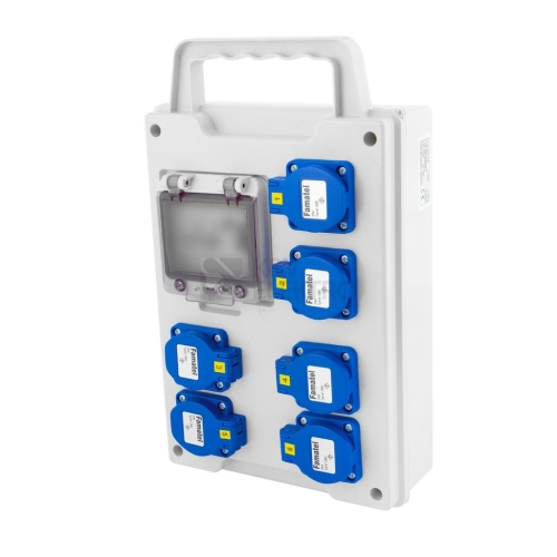 Přenosná zásuvková skříň FAMATEL eb371-6kA-EB600000.0 /4M IP44 jištěná bez chrániče, zásuvky 6x230V, přístroje EATON 6kA: 3xPL6-B16/1, použité pouzdro: 6201-10 (4mod.) - 355x215x85mm, barva: světle šedá.Přenosná zásuvková skříň (rozváděč nízkého napětí) FAMATEL eb371-6kA-EB600000.0 /4M IP44 jištěná bez chrániče, zásuvky 6x230V/16A (s ochranným kolíkem dle ČSN), jistící přístroje EATON 6kA: 3xPL6-B16/1, použité pouzdro: 6201-10 - celkem k dispozici 4mod. místa, rozměry: 355x215x85mm, plastová, materiál ABS, IK08, zkouška žhavou smyčkou 650°C, bezhalogenová a UV odolná, montáž na povrch, barva: světle šedá, rozsah teplot -25°C +85°C, aplikované normy: IEC 61439-3 (Rozváděče nízkého napětí - Část 3: Rozvodnice určené k provozování laiky (DBO), balení: 1ks (fólie), zásuvky na 230V/16A s ochranným kolíkem dle ČSN, polykarbonátové okénko, jistící prvky EATON, PE svorkovice součástí (6x16mm2), N svorkovice součástí (6x16mm2), hladké stěny (bez prolisů) pro vyvrtání vstupního otvoru a následné osazení příslušnou vývodkou, max. připojitelný vstupní kabel = 5x16 (Cu), dodáno s průvodní dokumentací: štítkem rozváděče, návodem pro obsluhu a montáž, krycím listem (charakteristiky rozhraní), protokolem o kusové zkoušce, ES prohlášením o shodě, schématem zapojení a zkouškou oteplení pro rozváděče nízkého napětí.