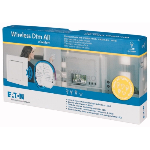 RF Stmívací sada CPAD-00/213 - Wireless Dim All Komfortní stmívání stmívatelných zdrojů včetně LED! Sada pro aplikace, kde je požadováno plynulé a bezhlučné stmívání libovolného stmívatelného zdroje (halogenky 230 V, žárovky, LED žárovky, ESL úsporky) bez žhnutí ve vypnutém stavu. Instalaci komponent lze realizovat během několika minut, protože stmívací sada je připravena a naprogramována pro rychlou instalaci a ovládání stmívání odkudkoli. Je flexibilnější než použití tradičního stmívače. Sada obsahuje Bezdrátové tlačítko, barva bílá lesklá, kompatibilní s rámečky 55x55 mm Smart stmívací aktor 250 W ##VIDEO:https://www.youtube.com/embed/zXx7xHWgAks## ##VIDEO:https://www.youtube.com/embed/plvOrwiZJTk##