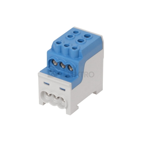 Blok pro rozdělení fází UVB 200 N, 1pólový, jmenovitý proud Cu 200A, Al 185A, jmenovité napětí 1000V AC / 1500V DC, barva modrá, montáž na DIN lištu, krytí IP20, vstup 1x70mm2, výstup 1x35mm2, 6x16mm2, řaditelný