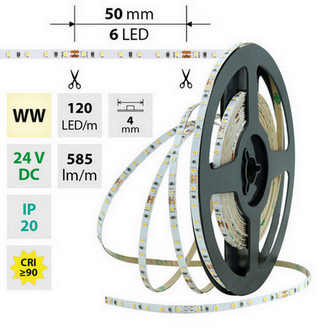 LED pásek SMD2216, 2800-3100K (teple bílý WW), 7,2W, 120LED, 585lm/m, segment 50mm, 6LED/segment, IP20, DC 24V, životnost 54000h, šíře 4mm, bílý PCB pásek, max. délka pásku při jednostranném zapojení: 5m, opatřen samolepící páskou 3M, UV stabilní.
