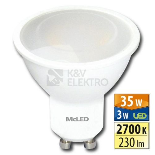LED žárovka 3W, GU10, (ekvivalent 35W), 230V, IP20, 2700K - teplá bílá, světelný tok 230lm, vyzařovací úhel 100°, Ra>80, úspora až 85%, životnost až 25.000h, A+, rozměry ø 50x56, materiál PBT/plast, nestmívatelné, PF 0,44