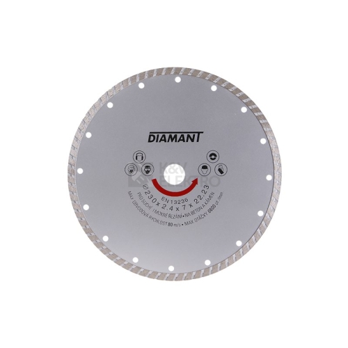 Diamantový kotouč DIAMANT průměr brusného kotouče: 230 mm průměr otvoru: 22,2 mm provedení : TURBO přiložen redukční kroužek z 22,2 na 20 mm balení : blistr s eurootvorem - vysoký obsah diamantového prachu - kvalitní materiály i zpracování Diamantový kotouč 230 DIAMANT TURBO, určený pro suché i mokré řezání betonu, cihel, zdiva, kamene, vysoce efektivní řezání a rychlé díky speciální konstrukci pevně uchycených diamantových segmentů k nosnému disku kotouče.