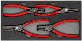 V pěnové vložce pro pracovní stůl a dílenský vozík. K přehlednému uchovávání nářadí. Přesná vybrání pro uložení kleští. Rozměry pěnové vložky (Š x V x H): 335 x 33 x 165 mm. Materiál: dvoubarevná pěnová hmota s uzavřenými póry. čtvery přesné kleště na pojistné kroužky v pěnové vložce.