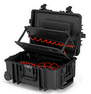 Kufr vhodný pro leteckou přepravu, z odolného polypropylénu. Prachotěsný a vodotěsný. Automatický ventil pro vyrovnání tlaku. Odolný vůči teplotám od - 30 °C do +80 °C. Zařízení pro visací zámek. Přihrádka na dokumenty- tabule s nářadím s 54 plnitelnými kapsami na nářadí a 94 poutky na nářadí. Uzamykatelné dno individuálně dělitelné systémem hliníkových přepážek. Ergonomická dvousložková rukojeť. Se dvěmi lehkoběžnými kladkami. S teleskopickým držadlem. Objem: 45 l. Zatížitelnost do 35 kg.