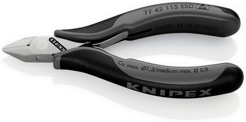 Pro přesné montážní práce, např. v oblasti elektroniky a jemné mechaniky. Rukojeti elektricky svodivé - disipativní. Stabilní průvlečný kloub bez vůle. Dvojitá pružina s malým třením pro měkké a stejnoměrné otevírání. Vysoce lesklý povrch ve spojení s jemným olejovým filmem poskytuje dobrou ochranu proti korozi - žádné poruchy ve spínacím obvodu způsobené olupováním chromovaných částí. Břity doplňkově induktivně tvrzené. Rukojeti s dvoubarevnými vícesložkovými návleky černé/šedé. Speciální nástrojová ocel ve zvláštní jakosti, kovaná,kalené v oleji v několika stupních. špičaté čelisti, bez fazety. Tvrdost břitů asi 57 HRC.