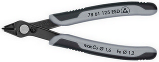 Precizní kleště pro nejjemnější stříhací práce např. v elektronice a jemné mechanice. Rukojeti elektricky svodivé - disipativní. Broušené, velmi tvrdé břity bez fasety. Střih nůžek s kontrolovaným mikro přesazením střižných hran pro mimořádně precizní střih i těch nejtenčích drátů a pro dlouhou životnost. Precizně tvarované hroty oddělí i sousední dráty od Ø 0,2 mm. Kloub s čepem z ušlechtilé oceli. Extrémně lehký chod pro snížení únavy při práci. S otevírací pružinou a omezením rozevření. Břity doplňkově induktivně tvrzené, tvrdost břitů asi 64 HRC kováno. Speciální nástrojová ocel, brunýrovaná.