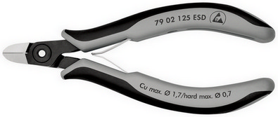 Rukojeti elektricky svodivé - disipativní. Precizní kleště pro nejjemnější stříhací práce např. v elektronice a jemné mechanice. Velmi přesně broušené, ostré břity s velmi malými fazetami na přesné řezy u citlivých elektronických součástek, rovněž bez fazet pro přesné odštípnutí. Břity doplňkově induktivně tvrzené, tvrdost břitů asi 64 HRC kováno. Hmotnost cca o 20 % nižší než u konvenčních kleští na elektroniku. šroubový kloub s precizně vyrobenými kloubními plochami pro rovnoměrný pohyb s malým třením v celém rozsahu rozevření.. Dvojitá pružina s malým odporem pro snadné a rovnoměrné rozevření.. Ergonomicky optimalizované vícesložkové návleky rukojetí. Chromovaná ocel na kuličková ložiska, kalená v oleji v několika stupních. Kulatá hlava.