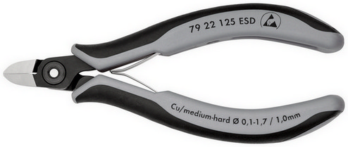 Rukojeti elektricky svodivé - disipativní. Precizní kleště pro nejjemnější stříhací práce např. v elektronice a jemné mechanice. Velmi přesně broušené, ostré břity s velmi malými fazetami na přesné řezy u citlivých elektronických součástek, rovněž bez fazet pro přesné odštípnutí. Břity doplňkově induktivně tvrzené, tvrdost břitů asi 64 HRC kováno. Hmotnost cca o 20 % nižší než u konvenčních kleští na elektroniku. šroubový kloub s precizně vyrobenými kloubními plochami pro rovnoměrný pohyb s malým třením v celém rozsahu rozevření.. Dvojitá pružina s malým odporem pro snadné a rovnoměrné rozevření.. Ergonomicky optimalizované vícesložkové návleky rukojetí. Chromovaná ocel na kuličková ložiska, kalená v oleji v několika stupních. Kulatá hlava.