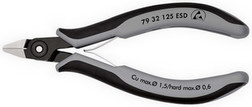 Rukojeti elektricky svodivé - disipativní. Precizní kleště pro nejjemnější stříhací práce např. v elektronice a jemné mechanice. Velmi přesně broušené, ostré břity s velmi malými fazetami na přesné řezy u citlivých elektronických součástek, rovněž bez fazet pro přesné odštípnutí. Břity doplňkově induktivně tvrzené, tvrdost břitů asi 64 HRC kováno. Hmotnost cca o 20 % nižší než u konvenčních kleští na elektroniku. šroubový kloub s precizně vyrobenými kloubními plochami pro rovnoměrný pohyb s malým třením v celém rozsahu rozevření.. Dvojitá pružina s malým odporem pro snadné a rovnoměrné rozevření.. Ergonomicky optimalizované vícesložkové návleky rukojetí. Chromovaná ocel na kuličková ložiska, kalená v oleji v několika stupních. špičatá hlava.