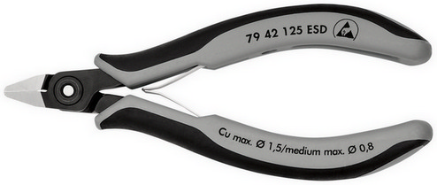 Rukojeti elektricky svodivé - disipativní. Precizní kleště pro nejjemnější stříhací práce např. v elektronice a jemné mechanice. Velmi přesně broušené, ostré břity s velmi malými fazetami na přesné řezy u citlivých elektronických součástek, rovněž bez fazet pro přesné odštípnutí. Břity doplňkově induktivně tvrzené, tvrdost břitů asi 64 HRC kováno. Hmotnost cca o 20 % nižší než u konvenčních kleští na elektroniku. šroubový kloub s precizně vyrobenými kloubními plochami pro rovnoměrný pohyb s malým třením v celém rozsahu rozevření.. Dvojitá pružina s malým odporem pro snadné a rovnoměrné rozevření.. Ergonomicky optimalizované vícesložkové návleky rukojetí. Chromovaná ocel na kuličková ložiska, kalená v oleji v několika stupních. špičatá hlava.