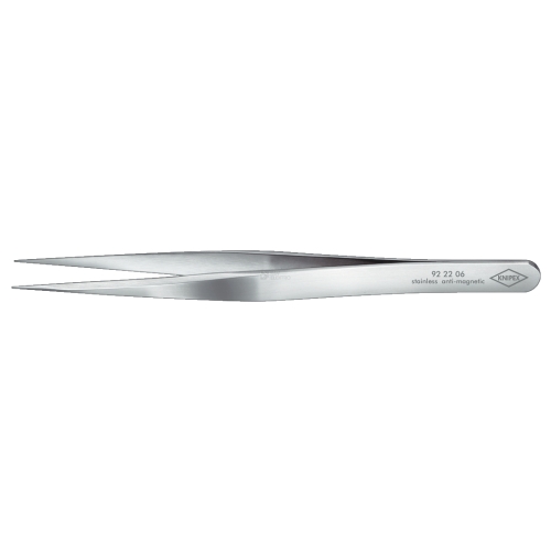 Pro jemné montážní práce. Rovný tvar. Plochy čelistí hladké. Obzvláště úzké hroty. Matováno. Plochy čelistí matované pro optimální uchopení. Chromniklová ocel: nerezová, antimagnetická (18/10), velmi běžná kvalita pro elektroniku.