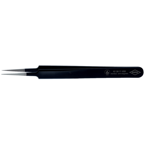 Chromniklová ocel: nerezová, antimagnetická (18/10), velmi běžná kvalita pro elektroniku. Povrchová úprava v provedení ESD: matově černé, s povrchovým odporem asi 10⁵ ohmů. Hroty kartáčované do matového lesku. Plochy čelistí matované pro optimální uchopení. Chromniklová ocel, nerezavějící, antimagnetická. Jemné jehlové hroty. Rovný tvar. Plochy čelistí hladké.