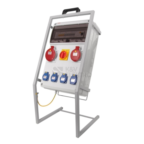 Staveništní rozváděč FAMATEL v62524-ZSFV40101000.1 /3952 IP44 jištěný s chráničem 40/4/003 a hl. vypínačem 40A na kov. stojanu, zásuvky 4x230V, 1x16/5, 1x32/5, přístroje EATON 10kA: 2xPL7-B16/1, 1xPL7-B16/3, 1xPL7-B32/3, PF7-40/4/003 na vstupu, použité pouzdro: 3952 - 500x330x150mm, použitý stojan: 7052: 830x380x500mm, barva (komaxit): světle šedá.