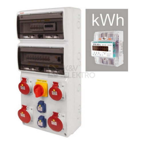 Staveništní rozváděč FAMATEL v8472-ZSFV20202000.1 /3977 IP44 jištěný s chráničem 63/4/003 a hl. vypínačem 63A, elektroměr, určený pro montáž na omítku/zeď/povrch, zásuvky 2x230V, 2x16/5, 2x32/5, přístroje EATON 10kA: 2xPL7-B16/1, 2xPL7-B16/3, 2xPL7-B32/3, PF7-63/4/003 na vstupu, použité pouzdro: 3977 - 685x330x150mm, barva: světle šedá.