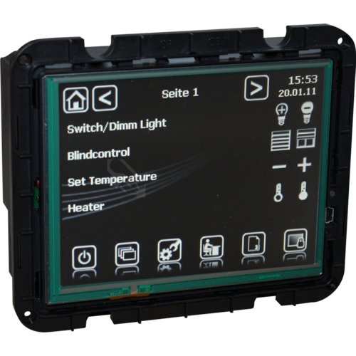 Grafický TFT barevný displej s LED podsvícenímVšechny důležité standardní funkce a indikace stavu systému KNXChráněno heslem, logický modul, modul alarmu atd.Možnost přidělení hesla pro 10 hlavních uživatelských stran a všechny konfigurační stránkyIndividuální přidělení symbolů110 funkcí KNX ve formě uživatelských stránekAž 64 snadno konfigurovatelných scénJednoduchá obsluhaIntegrovaný týdenní spínací plánSimulace přítomnostiLogické propojení až 60 objektůNapětí : 230 V AC 50 / 60 HzRozměry : 195 x 155 x 4 mmSpotřeba elektrické energie : 11 WStupeň krytí : IP20 / třída IOkolní teplota : 0 °C až +45 °CUkazatele : LED red when displaying normal/adressing mode Graphic-compatible 5,7'' TFT colour display 320 x 240 pixels with LED background illuminationKNX TP 256: Ano(in translation) 3x 1,5 mm² eindrähtig und mehrdrähtig (Netzversorgung)||Buslinie: Busklemme EIB/KNX (schwarz/rot)||USB-Buchse Mini Typ B (Verwendung nur im Bedarfsfall)Výrobce: B.E.G. Brück Electronic GmbHBarva: -Výr. číslo: 90120Typ: KNX Control Touch-Panel
