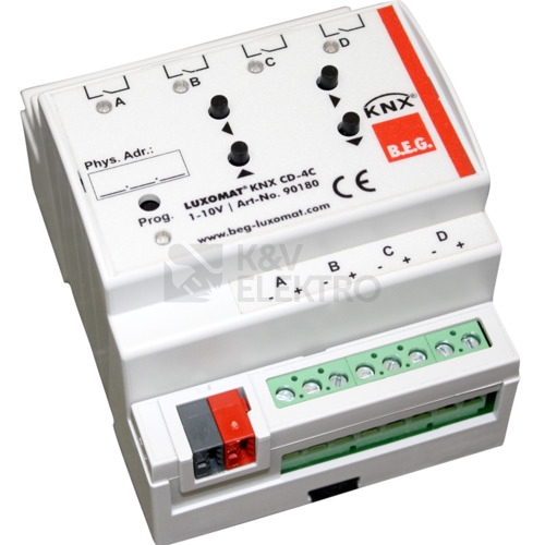 Stmívací ovladače KNX CD-4C slouží ke spínání a stmívání zářivek s 1-10V elektronickým předřadníkem. Napětí je přitom do elektronického předřadníku přiváděno přes relé přístroje.Regulace světel je realizována prostřednictvím 1-10V napětí. Napětí 1-10 V dodává elektronický předřadníkPřístroj je vybaven ochranou proti zkratu a proti nadměrné teplotě a také soft startem šetrným k žárovkámPřístroj je určen pro pevnou instalaci na lištu DIN v silnoproudých rozvodechMontáž musí být provedena v suchých interiérechNapětí : 230 V ACRozměry : (4 TE) 86 x 72 x 60 mmVýstupní napětí : 230 V AC 50 HzStupeň krytí : IP20 / třída IIOkolní teplota : 0 °C až +45 °CBydlení : Plast LEXAN UL-94-V0Ukazatele : červený LED programování LED zelený LED: stav kanáluProvoz ruční : Ruční ovládání spínacích kanálů přímo na zařízeníSpínací kapacita : 16 A cos φ = 1 odporová zátěž 2700 W HV halogenové žárovky 1000 W LV halogenové žárovky 2500 W fluorescentní nekompenzované zářivky 1800 W zářivky paralelně kompenzované 1000 W kapacitní zátěž max. 100 µFVýkon DIM : pro 1-10 V DC regulační kanál 30 mAVýrobce: B.E.G. Brück Electronic GmbHBarva: bíláVýr. číslo: 90180Typ: KNX CD-4C