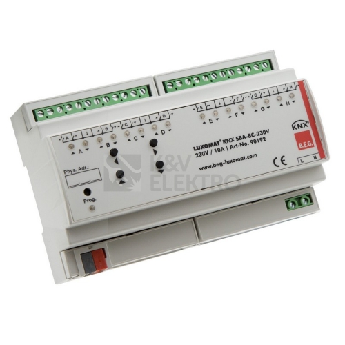 Ovladače žaluzií KNX SBA-4C-230V a KNX SBA-8C-230V přijímají telegramy KNX a řídí více žaluziových pohonů s koncovými vypínači nezávisle na soběKaždý kanál je spínán prostřednictvím dvou monostabilních relé a dá se navíc aktivovat manuálně tlačítkem na ovladačiOvladače žaluzií KNX SBA-4C-230V a KNX SBA-8C-230V přijímají telegramy KNX a řídí více žaluziových pohonů s koncovými vypínači nezávisle na soběSpínací polohy relé lze pro případ výpadku sběrnicového napětí nebo obnovy naprogramovat individuálně pro každý kanálPřístroj je určen pro pevnou instalaci na lištu DIN v silnoproudých rozvodechMontáž musí být provedena v suchých interiérechNapětí : 230 V AC 50 HzRozměry : (8 TE) 86 x 144 x 60 mmVýstupní napětí : 230 V AC 50 HzStupeň krytí : IP20 / třída IIOkolní teplota : 0 °C až +45 °CBydlení : Plast LEXAN UL-94-V0Ukazatele : červený LED programování LED zelený LED: stav kanáluProvoz ruční : Ruční ovládání spínacích kanálů přímo na zařízeníKNX TP 256: AnoSpínací kapacita : 600 VA, cos φ = null Žaluziové motoryVýrobce: B.E.G. Brück Electronic GmbHBarva: bíláVýr. číslo: 90192Typ: KNX SBA-8C-230V