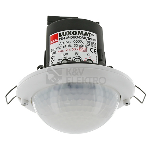Detektor přítomnosti pro dvě oddělené skupiny světel k regulaci osvětlení v závislosti na denním světleSpolečný detekční rozsahDvě nezávislá, pohyblivá světelná čidlaDALI/DSI interface for control of digital dimmable electronic ballasts as a groupPomocí dálkového ovládání nebo DIP přepínače lze přepínat mezi DSI a DALI režimemProvedení detektor Master Možné rozšíření detekčního rozsahu pomocí přístrojů detektor slaveDalší funkce jsou nastavitelné dálkovým ovládánímMožné manuální zapínání a stmívání tlačítkemFunkce orientačníPoloautomatický, plně automatický nebo režim soumrakového spínače. Napětí : 110 – 240 V AC 50 / 60 HzRozměry : Ø 97 x 103 mmSpotřeba elektrické energie : ca. 1 WDetekčním rozsahem : vertikální 360°Dosah : max. Ø 24 m křížem max. Ø 8 m přímo max. Ø 6,4 m sedícíVelikost snímaného prostoru pro nepřímý pohyb, v případě montáže v doporučené výšce : 450 m² / 2,5 m montážní výška(in translation): 2 m / 10 m / 2,5 mStupeň krytí : IP20 / třída IIOkolní teplota : -25 °C až +50 °CBydlení : obal UV a nárazuvzdorný polykarbonát kanál 1 a kanál 2 (ovládání osvětlení)Výstup DALI: až do 25 DALI / DSI-EB pro každý kanálČas dobehu : 1 min – 30 minOrientační světlo : 20 % / 5 s – 60 min / ∞Nastavená hodnota jasu : 10 – 2000 lux měření smíšeného světlaVýrobce: B.E.G. Brück Electronic GmbHBarva: bílá mat, podobný RAL9010Výr. číslo: 92276Typ: PD4-M-DUO-DALI/DSI-FC