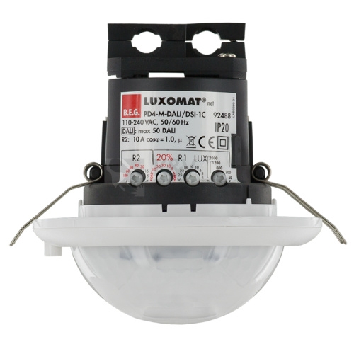 Detektor přítomnosti s velkým dosahem k regulaci osvětlení v závislosti na denním světleRozhraní DALI k nastavení digitálních, stmívatelných elektronických předřadníků jako skupinyJeden přídavný přepínací kanál s mnoha funkcemi: mezní funkce pro vypnutí elektronického předřadníku nebo funkce HVAC pro úspornou obsluhu vytápění, ventilace nebo klimatizačních jednotek. Pomocí dálkového ovládání nebo DIP přepínače lze přepínat mezi DSI a DALI režimemFunkce orientačníRelé s volfrámovým předběžným kontaktem, optimalizované pro zatížení LED. Provedení detektor Master Možné rozšíření detekčního rozsahu pomocí přístrojů detektor slaveMožné manuální zapínání a stmívání tlačítkemDalší funkce jsou nastavitelné dálkovým ovládánímVyloučení ztrát v pohotovostním režimu světelného systému v souladu s EnEV DIN V 18599-4Poloautomatický, plně automatický nebo režim soumrakového spínače. Tovární nastavení 10 min a 500 LuxNapětí : 110 – 240 V AC 50 / 60 HzRozměry : FC= Ø 97 x 103 mmSpotřeba elektrické energie : ca. 1 WDetekčním rozsahem : vertikální 360°Dosah : max. Ø 24 m křížem max. Ø 8 m přímo max. Ø 6,4 m sedícíVelikost snímaného prostoru pro nepřímý pohyb, v případě montáže v doporučené výšce : 450 m² / 2,5 m montážní výška(in translation): 2 m / 10 m / 2,5 mStupeň krytí : FC= IP20 / třída II SM= IP54 / třída IIOkolní teplota : -25 °C až +50 °CBydlení : obal UV a nárazuvzdorný polykarbonát kanál 1 (ovládání osvětlení)Výstup DALI: až do 50 DALI / DSI-EBČas dobehu : 1 min – 30 minOrientační světlo : 20 % / OFF / 5 min – 60 min / ∞Nastavená hodnota jasu : 10 – 2000 lux kanál 2 (HVAC nebo ovládání osvětlení)Spínací kapacita : 2300 W, cos φ = 1 1150 VA, cos φ = 0,5 300 W LED max. náběhový proud Ip (20 ms) = 165 A max. náběhový proud Ip (200 µs) = 800 ATyp kontaktu : 1x µ kontakt, bez kontaktu s náběhovým wolframovým kontaktemČas dobehu : 5 min – 120 min, poplachový impuls, impuls měření smíšeného světlaVýrobce: B.E.G. Brück Electronic GmbHBarva: bílá mat, podobný RAL9010Výr. číslo: 92488Typ: PD4-M-DALI/DSI-1C-FC