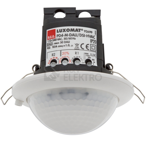 Detektor přítomnosti s velkým dosahem k regulaci osvětlení v závislosti na denním světleRozhraní DALI k nastavení digitálních, stmívatelných elektronických předřadníků jako skupinyPomocí dálkového ovládání nebo DIP přepínače lze přepínat mezi DSI a DALI režimemJeden další bezpotenciálový spínací kanál s mnoha funkcemi: mezní funkce pro vypnutí elektronického předřadníku nebo funkce HVAC pro úsporné ovládání topení, ventilace a klimatizačních jednotek. Poplachový puls: detektor se spustí, pouze když jsou detekovány 3 pohyby během 9 sekund. Funkce orientačníRelé s volfrámovým předběžným kontaktem, optimalizované pro zatížení LED. Provedení detektor Master Možné rozšíření detekčního rozsahu pomocí přístrojů detektor slaveMožné manuální zapínání a stmívání tlačítkemDalší funkce jsou nastavitelné dálkovým ovládánímVyloučení ztrát v pohotovostním režimu světelného systému v souladu s EnEV DIN V 18599-4Poloautomatický, plně automatický nebo režim soumrakového spínače. Tovární nastavení 10 min a 500 LuxNapětí : 110 – 240 V AC 50 / 60 HzRozměry : Ø 97 x 103 mmSpotřeba elektrické energie : ca. 1 WDetekčním rozsahem : vertikální 360°Dosah : max. Ø 24 m křížem max. Ø 8 m přímo max. Ø 6,4 m sedícíVelikost snímaného prostoru pro nepřímý pohyb, v případě montáže v doporučené výšce : 450 m² / 2,5 m montážní výška(in translation): 2 m / 5 m / 2,5 mStupeň krytí : IP20 / třída IIOkolní teplota : -25 °C až +50 °CBydlení : obal UV a nárazuvzdorný polykarbonát kanál 1 (ovládání osvětlení)Výstup DALI: až do 50 DALI / DSI-EBČas dobehu : 1 min – 30 minOrientační světlo : 20 % / OFF / 5 min – 60 min / ∞Nastavená hodnota jasu : 10 – 2000 lux kanál 2 (ovládání HVAC / osvětlení) beznapěťový kontaktSpínací kapacita : 2300 W, cos φ = 1 1150 VA, cos φ = 0,5 300 W LED max. náběhový proud Ip (20 ms) = 165 A max. náběhový proud Ip (200 µs) = 800 ATyp kontaktu : 1x µ kontakt, bezpotenciálový bez kontaktu s náběhovým wolframovým kontaktemČas dobehu : 5 min – 120 min, poplachový impuls, impuls měření smíšeného světlaVýrobce: B.E.G. Brück Electronic GmbHBarva: bílá mat, podobný RAL9010Výr. číslo: 92699Typ: PD4-M-DALI/DSI-HVAC-FC