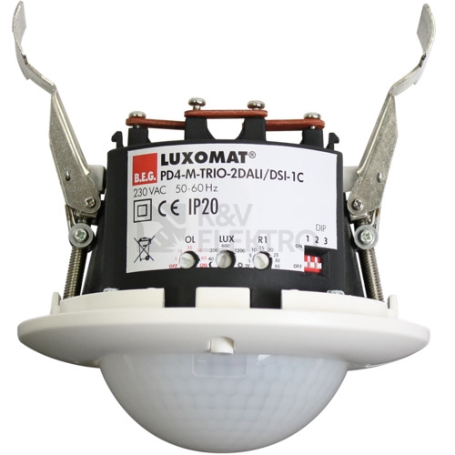 Detektor přítomnosti pro dvě oddělené skupiny světel k regulaci osvětlení v závislosti na denním světleJeden bezpotenciálový spínací kanál pro spínání HVAC nebo osvětleníDvě nezávislá, pohyblivá světelná čidlaSpolečný detekční rozsahDALI/DSI interface for control of digital dimmable electronic ballasts as a groupMožné přepínání dálkovým ovládáním mezi programy DALI a DSIFunkce orientačníRelé s volfrámovým předběžným kontaktem, optimalizované pro zatížení LED. Provedení detektor Master Možné rozšíření detekčního rozsahu pomocí přístrojů detektor slaveMožné manuální zapínání a stmívání tlačítkemPoloautomatický, plně automatický nebo režim soumrakového spínače. Další funkce jsou nastavitelné dálkovým ovládánímTypické aplikace: Napětí : 110 – 240 V AC 50 / 60 HzRozměry : FC= Ø 117 x 100 mmSpotřeba elektrické energie : ca. 2 WDetekčním rozsahem : vertikální 360°Dosah : max. Ø 24 m křížem max. Ø 8 m přímo max. Ø 6,4 m sedícíVelikost snímaného prostoru pro nepřímý pohyb, v případě montáže v doporučené výšce : 450 m² / 2,5 m montážní výška(in translation): 2 m / 10 m / 2,5 mStupeň krytí : SM= IP20 / třída II FC= IP20 / třída IIOkolní teplota : -25 °C až +50 °CBydlení : obal UV a nárazuvzdorný polykarbonát kanál 1 a kanál 2 (ovládání osvětlení)Výstup DALI: až do 25 DALI / DSI-EB pro každý kanálOrientační světlo : 10 – 30 % / OFF / 1 min – 60 min / ∞ kanál 3 ( HVAC / kontrola osvětlení - beznapěťový kontakt)Spínací kapacita : 3000 W, cos φ = 1 1500 VA, cos φ = 0,5 300 W LED max. náběhový proud lp (20 ms) = 165 A max. náběhový proud lp (200 µs) = 800 ATyp kontaktu : 1x µ kontaktem, NOC bezpotenciálový / s náběhovým wolframovým kontaktem kanál 1 až kanál 3Čas dobehu : 1 min – 60 minNastavená hodnota jasu : 10 – 2000 lux měření smíšeného světlaVýrobce: B.E.G. Brück Electronic GmbHBarva: bílá mat, podobný RAL9010Výr. číslo: 92756Typ: PD4-M-TRIO-2DALI/DSI-1C-FC