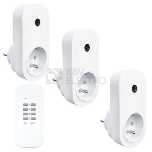 3 x zásuvka a 1 x dálkový ovladač jednduché spárování zásuvky s ovladačem max.: 2000W, AC 230V/8,7A možnost ovládání až 4 zásuvek dětské pojistky dosah signálu na otevřeném prostranství: 40m manuální přiřazení zásuvek k ovladači přenosová frekvence: 433,92MHz napájení: dálkový ovladač: 1 x CR2032 baterie (součástí balení) možnost spárování s přídavnou zásuvky Solight DY08S zásuvky: AC 230V, 50Hz pracovní teplota: 0°C až +35°C barva: bílá