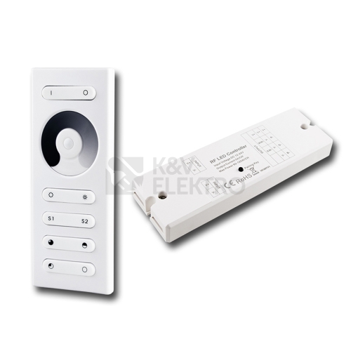 RF dálkové ovládání pro řízení jasu jednobarevných LED pásků (dosah až 20 m), 1 zóna. Možnost uložit aktuální nastavení úrovně jasu pod scény (S1, S2). Rozměry ovladače: 120×48×17,6mm (napájení 3xAAA baterie - nejsou součástí), přijímače: 145×46,5×16mm. Max. zátěž: 180W/12V, 360W/24V.