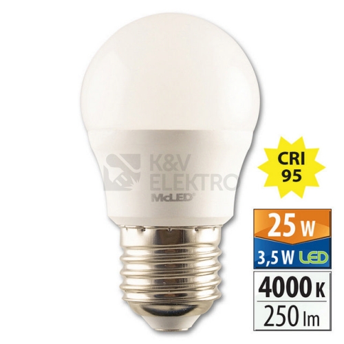LED žárovka G45 kapka 3,5W (ekvivalent 25W), patice E27, 230V, 4000K - neutrální bílá, světelný tok 250lm, vyzařovací úhel 200°, Ra>95, úspora až 86%, životnost až 25.000h, 15.000 spínacích cyklů, A+, rozměry ø 46 x 82 mm, nestmívatelná