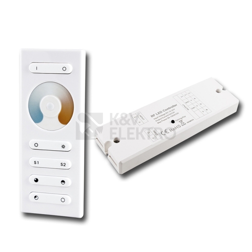 RF dálkové ovládání pro řízení jasu a teploty bílé u double white LED pásků (dosah až 20 m), 1 zóna. Možnost uložit aktuální nastavení teploty bílé a jasu pod scény (S1, S2). Rozměry ovladače: 120×48×17,6mm (napájení 3xAAA baterie - nejsou součástí), přijímače: 145×46,5×16mm. Max. zátěž: 120W/12V, 240W/24V.