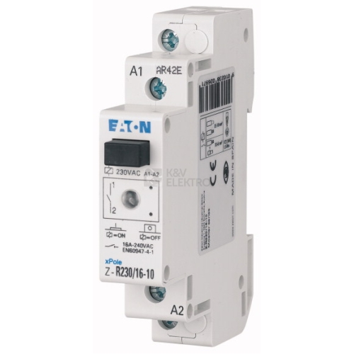 Instalační relé EATON Z-R230/16-10 od oblíbeného a osvědčeného výrobce nabízí snadnou instalaci na DIN lištu a nízké energetické ztráty a 1 spínací kontakt. Využijete jej například pro řízení a spínání světel či topení, větrání a tepelných čerpadel. Specifikace instalačního relé EATON Z-R230/16-10 16A CS-R16A230B100 EATON instalační relé Z-R230/16-10 se díky svému nehlučnému provozu skvěle hodí pro instalaci například v hotelech, nemocnicích a kancelářích. Optická signalizace provozního stavu zajišťuje spolehlivá LED kontrolka. U Instalačního relé Z-R230/16-10 lze ručně otestovat funkci pomocí tlačítka. Kromě modulových relé si u nás můžete pořídit i další modulové a paticové přístroje, jako jsou například jističe do 125 A, proudové chrániče, stykače, motorové spouštěče či elektroměry. Technické detaily EATON Z-R230/16-10 Instalační relé EATON Z-R230/16-10 je konstruováno pro napětí 230V, a dimenzovaný proud 16A. Jeho montážní hloubka je 60mm. Vždy se řiďte postupem od výrobce a montáž provádějte jen tehdy, jste-li k takovému úkonu oprávněni. V opačném případě přenechte instalaci na odborníkovi s příslušným certifikátem. Certifikáty výrobku Instalační relé EATON 230VAC 1NO Z-R230/16-10 ICS-R16A230B100 splňuje příslušné normy ČSN.