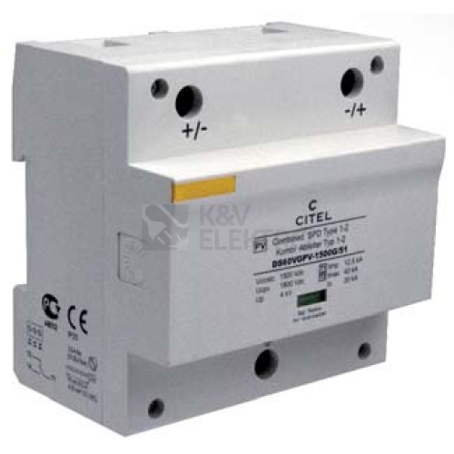 Přepěťová ochrana DS60VGPV/G/51 je schopna svádět jak přepětí, tak i bleskové proudy a je určena především pro ochranu fotovoltaických zařízení před bleskovými proudy a přepětím. Dodává se ve třech napěťových úrovních - pro napětí 600 VDC, 1000 VDC a 1500 VDC. Tyto ochrany jsou v souladu s francouzskou směrnicí UTE C61-740-51 a evropskou normou EN50539-11 a mohou být použity podle francouzské směrnice UTE C15-712-1 a podle evropské normy EN 50539-12. Přepěťová ochrana DS60VGPV/G/51 je kombinovaná přepěťová ochrana typu 1 a 2 s impulsním bleskovým proudem 12,5 kA (10/350) na pól, což zajišťuje bezpečnou ochranu proti blízkému i přímému úderu blesku. Konstrukčně je řešena jako monoblok bez výměnných modulů. Ochranný modul obsahuje osvědčené zapojení - kombinaci plynem plněného jiskřiště (GSG) a vysokovýkonných varistorů - tzv. technologii VG. Kombinovaný svodič přepětí typu 1+2 na základě plynem plněného jiskřiště a varistoru Záruka 10 let Bleskový proud na pól: Iimp = 12,5 kA (10/350 us) Bezpečné odpojovací zařízení Dvojitá galvanická izolace Nedochází ke stárnutí v důsledku propustného (unikajícího) proudu Zapojení do Y odolné proti přepólování a chybnému zapojení Dálková signalizace standardně Splňuje normy IEC 61643-1, EN 61643-11, EN 50539-11 a UTE C 61-740-51 V souladu s normami UTE C 15-712-1 2010, EN 50539-12, VDE V 0675-39-12 a VDE 0185-305 příloha 5