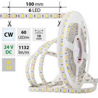 LED pásek SMD5050, studená bílá (6000K), 14,4W, 60LED, 1132lm/m, segment 100mm, 6LED/segment, IP54, DC 24V, životnost 54000h, šíře 10mm, bílý PCB pásek, max. délka pásku při jednostranném zapojení: 7m, opatřen samolepící páskou 3M.