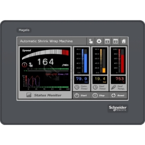 Toto rozhraní operátora HMI (Magelis STO) pro malé dotykové obrazovky (Magelis STP) je dodáváno s 12V až 24V DC, má 4,3" barevný TFT LLCD displej, 480 x2 pixel a 2EEL. Má také 1 hostitelský port + 1 port mini-B USB a 1 port RS232C / RSR485. Je ideální pro optimalizované informace a komunikaci s automatizačními systémy v průmyslu a infrastruktuře, jako jsou kompaktní stroje, manipulační systémy, stroje pro potravinářský průmysl a farmaceutický průmysl. Obrazovka zobrazí barevné grafické stránky. Díky hostitelskému portu RS485 je ideální na dohled a řízení jednoduchých systémů a strojů.