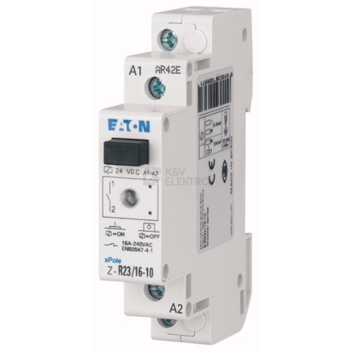 Instalační relé Z-R23/16-10 ke spínání spotřebičů do 16 A Kontakty: 1 spínací Ovládací napětí: 24 V DC Možnosti využití: Toto instalační relé nabízí univerzální řešení pro řízení a spínání osvětlení a elektrických topení, spínání větrání, tepelných čerpadel. Díky provozu bez hluku je řada Z-R 16A zvláště vhodná pro použití v hotelech, nemocnicích a kancelářích. Hlavní výhody: nízká provozní hlučnost díky inovativní technologii optická signalizace provozního stavu LED možnost ručně otestovat funkci pomocí tlačítka nízké energetické ztráty