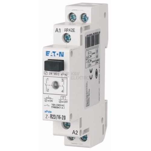 Instalační relé Z-R23/16-20 ke spínání spotřebičů do 16 A Kontakty: 2 spínací Ovládací napětí: 24 V DC Možnosti využití: Toto instalační relé nabízí univerzální řešení pro řízení a spínání osvětlení a elektrických topení, spínání větrání, tepelných čerpadel. Díky provozu bez hluku je řada Z-R 16A zvláště vhodná pro použití v hotelech, nemocnicích a kancelářích. Hlavní výhody: nízká provozní hlučnost díky inovativní technologii optická signalizace provozního stavu LED možnost ručně otestovat funkci pomocí tlačítka nízké energetické ztráty