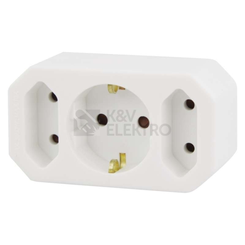 Zásuvka rozbočovací (adaptor) x 3 (2 x 2P + 1 x 2P+PE), Schuko, bílá 250 V/10 A max.Prodejní obal: 1 ks, závěsZAS.ROZBOC.3X BÍLÁ SCHUKO