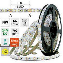 LED pásek SMD2835, neutrální bílá (4200K), 7W, 120LED, 700lm/m, segment 50mm, 6LED/segment, IP20, DC 24V, životnost 54000h, šíře 10mm, bílý PCB pásek, max. délka pásku při jednostranném zapojení: 10m, opatřen samolepící páskou 3M, UV stabilní. Délka 10m.