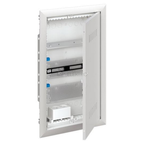 Zapuštěná multimediální rozvodnice s lištou DIN, perforovaný ocelový plech segmentové montážní desky, držáky vodičů, gumové držáky přístrojů a úchytky dvojitá zásuvka s adaptérem Euro s kovovým krycím rámem a větranými dvířky ##VIDEO:https://www.youtube.com/embed/HF6DMPCRC-8##