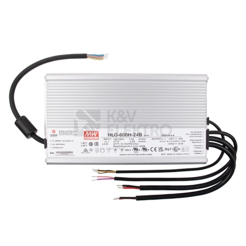 LED napájecí stmívatelný zdroj 600W. Stmívání signálem 10V PWM, 1-10V nebo R (10-100kohm). Krytí IP67, výstup 24VDC, max. 25A. Vstup: 90-305VAC, 47-63Hz, účinnost > 95%, PF > 0,95, materiál krytu: hliník. Rozměry: 280x144x49mm, hmotnost: 3,62kg. Při volbě zdroje počítejte s výkonovou rezervou min. 20%.