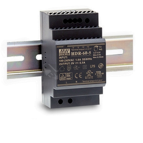 HDR-60-5 Mean Well Zdroj na DIN lištu, Inovovananá modelová řada DR-x-x, menší rozměry. Je vhodný pro použití v průmyslových i domácích kontrolních systémech, automatizaci budov, automatizaci výroby a elektromechanických přístrojích. Výkon: 32,5W Výstupní napětí: 5V Výstupní proud: 6,5A Univerzální vstup: 85 ~ 264VAC, 120 ~ 370VDC Ultra tenký design o šířce 52,5mm (3SU) Spotřeba při běhu na prázdno < 0,3W Izolační třída II LPS Pasivní chlazení Nastavitelné DC napětí na výstupu Určen pro DIN lištu TS-35/7,5 nebo 15 LED indikátor provozu Účinnost: 85% Provozní teplota: -30 ~ +70°C MTBF: 927,6K hod. Rozměry: 52,5 x 90 x 54,5mm Hmotnost: 190g Typy ochrany: protizkratová, proti přetížení, přepěťová