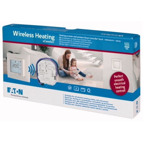 RF Vytápěcí sada CPAD-00/217 - Wireless Heating Komfortní ovládání topení dotykovým termostatem Sada pro regulaci vytápění v místnosti s PWM řízením různých zdrojů vytápění. Vhodné pro el. přímotopy a topné panely, infrazářiče, regulaci hlavic teplovodního podlahového vytápění nebo radiátorů a také el. podlahového vytápění (podlahový senzor PT1000 typ CSEZ-01/36, 177263 není součástí balíčku). Dotykový termostat s modrým podsvícením lze umístit na libovolný povrch a zvolit tak ideální místo pro měření teploty a vlhkosti v místnosti. Týdenní časový program a přednastavené teploty pro vytápění lze snadno uživatelsky měnit. Teploty: Komfort, Útlum, Noc, Ochrana proti mrazu a Uživatel. Termostat umožňuje rovněž řízení klimatizace a spínání ventilátoru při vysoké vlhkosti. Dotykovými tlačítky na displeji lze ovládat zastínění a spínat osvětlení – volitelně. Napájení termostatu: 2x baterie AAA nebo z napáječe 12-24V. Sada obsahuje Bezdrátový dotykový termostat, barva bílá lesklá, kompatibilní s rámečky 55x55 mm Vytápěcí aktor s PWM regulací 10 A ##VIDEO:https://www.youtube.com/embed/zXx7xHWgAks##
