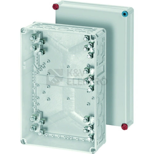 Kabelová krabicová rozvodka z vysoce kvalitního termoplastu. Pro nástěnné aplikace v budovách nebo chráněnou instalaci ve venkovním prostředí. Upevnění víka pomocí rychlouzávěrů. Kabelové vývodky a montážní příruby součástí příslušenství. Se svorkami do 70 mm², 5pólové. Kabelové vstupy přes metrické předlisy ve stěnách skříně.