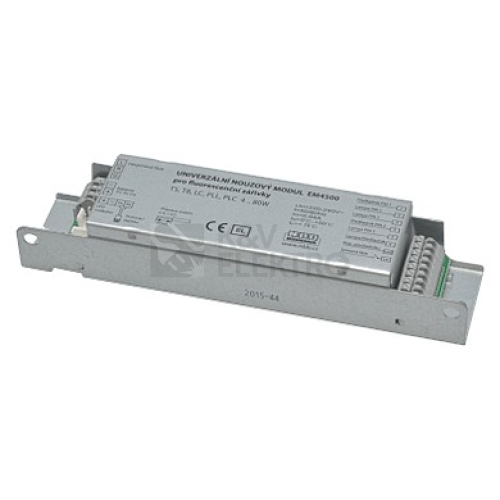 Nouzové elektronické moduly se běžně používají jako doplněk k zářivkovým svítidlům za účelem zajištění nouzového osvětlení při výpadku elektrické energie. Nouzový elektronický modul EM 4500 se vyznačuje univerzálním použitím, jednoduchým zapojením, inteligentním dobíjením, malými rozměry a nízkou spotřebou. Je plně kompatibilní se všemi fluorescenčními zdroji světla a se všemi typy elektronických nebo magnetických předřadníků. Řízené dobíjení zajišťuje optimální nabití a udržování baterie . Jednoduché, přehledné a funkční zapojení. Dlouhá životnost a bezpečnost, možnost volby ze dvou typů baterií podle výkonu fluorescenčního světelného zdroje. Optimální využití energie baterie a dlouhý čas v nouzovém režimu. Testovací tlačítko pro provedení kontroly funkčnosti a kontrolka nabíjení. Vhodné pro dodatečnou montáž do všech typů zářivkových svítidel.
